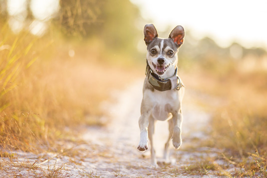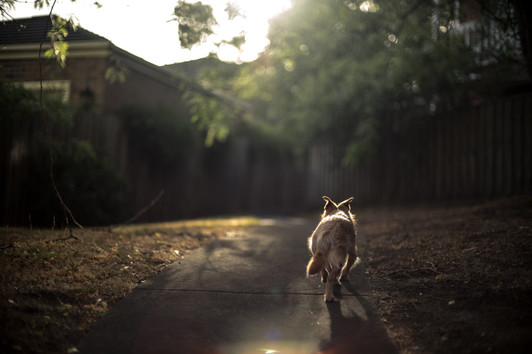 - This image was an instant fave. The golden light and warm tones, the long, soft shadows across the path, and the gorgeous depth of field all work together to make this a brilliantly managed image. I do find the flare at the bottom of the frame a little distracting, and think that the image would benefit from a slight crop at the bottom. There is also a long branch reaching down and appears to curve in the left frame (it could be a branch + a weed together) ... although the top of the branch with the few leaves adds depth to the image, the bottom of the branch with the perceived curve is somewhat distracting from the true hero of this image -- the adorable little dog walking away, but still paying attention to us with his flipped back ears. Just an all-around wonderful capture. Nicely done! ~ illona