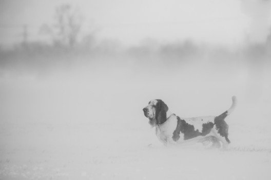 - This photo is fabulous. The muted tones accentuate the fog and allow the dog to stand out, and the choice to convert it to black and white lets the subject work with the muted, white landscape instead of stand out too much with its colors. The only thing I'd change is to attempt to remove the power lines, especially in the top left corner to lessen the weight there along with the trees and allow the full attention to remain on this wonderful dog. Nicely done. ~ illona