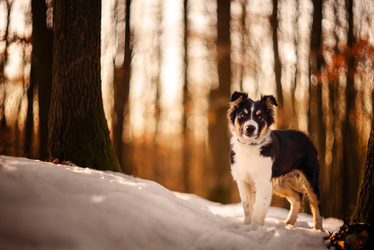- What a beautiful image. The soft glow and the golden tones, the soft bokeh, and the perfect framing of this image make it one that keeps the viewer coming back for more ... the eye going from the sweet pup, to the sparkles of light, the flashes of red leaves, the soft light, the tree bark, the light , the texture of the snow ... everything just works. Nicely done both in camera and out! ~ illona