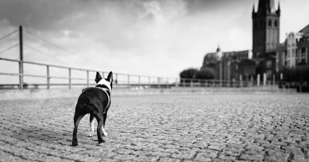 - Fabulous, fabulous image! So clean and strong. Beautiful conversion with bright whites and bold blacks; wonderful textures, and a strong leading line. Shot from behind, this image leads the viewer's eyes from the sweet little Boston, along that railing to the distant buildings, but always back to the little terrier. Expertly seen, captured, and managed in post. Well done! An instant fave. ~ illona