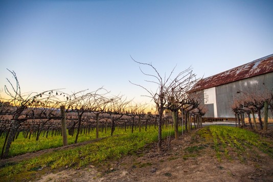 You have succeeded in catching the crisp light and you have exposed nicely for the colours but you could have found a more interesting angle. The subject is good, i like the opposing rusty hanger building and the rather desperate looking fruit trees but all of that could have been better composed. The branches make great silhouettes against the sky so a lower and closer angle through the trees could have been effective and that lower angle would have accentuated the lines of the building a little more and importantly would have taken the trees off the horizon, clearing another strong lead line. (I find your vignette a bit too hard too.)