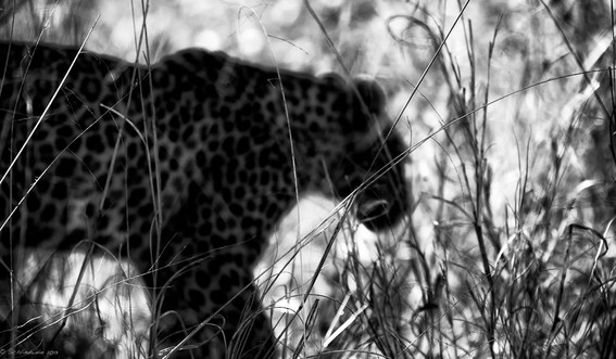 Here is an interesting shot and very unusual in the sense that the out of focus subject adds to the overall impact of the composition. Rules are there for breaking! The low angle and sharp grasses give a great sense of the wild, the blurry leopard takes on an imaginary, dreamy form and makes this photograph an art work. Quite stunning and very suited to the monochrome finish. This one really grows on you, well done, sensitive work and a bold approach considering the rarity of the subject.