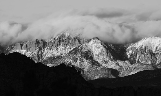 Beautiful exposure on the sunlit mountains and clouds brings so much detail to those areas but not without a price. In order to expose correctly in those brighter areas you have effectively under-exposed the darker ones. All detail has been lost in the foreground creating a very heavy and dark third at the bottom and although that does frame the mountains, with a nice foreground rocky ridge, it is just too black and adds nothing to your photograph. This is a common problem, especially up in the high contrast conditions of the mountains, but it can be corrected either with neutral density grad filters when you take your picture and/or by “dodging“ with a photo program when you get back to your computer. We used to do this all the time in the traditional photo lab. Personally i prefer to expose correctly for the shadow and filter the highlights. The problem arises of course because our cameras cannot read the whole dynamic light range that nature offers us and so we must choose correct highlights or correct shadows, or else adapt our technique with filtering and/or post processing or as some prefer, HDR. Well done though for this lovely atmosphere which you have seized almost perfectly.
