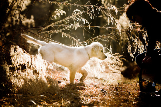 - beautifully seen and captured! an absolute masterpiece of light. the back glow on the weeds and the outline of the puppy are simply gorgeous. i would suggest boosting your contrast a little on the fill light you've applied to the back-lit pup so that it retains a natural appearance, especially given the strong shadow cast by the pup and how dark in shadow the owner remains in. compositionally, it works beautifully with the natural vignetting and inner glow ... but to make it look a little more natural and less manipulated, i'm wondering if some added contrast would help. otherwise, this is an absolutely lovely image, and an instant fave. ~ illona