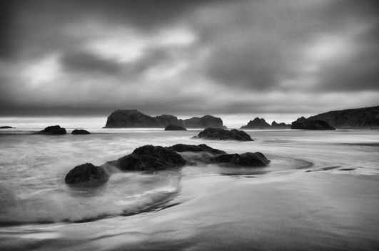 - Another overcast shot with plenty drama. The black and white works well and the slow shutter speed brings lovely movement to the water and clouds, creating a soft swirling effect which contrasts nicely with the rocky coast. The composition is strong, dividing the picture into three balanced parts of sand, sea and sky. It is a lovely moody photo and pleasing to the eye. Great effort, well done!