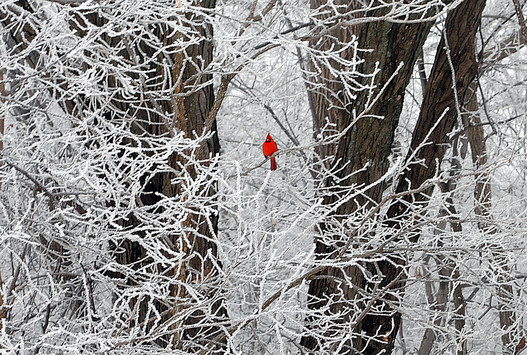 - My name is Mike Paquette and this photo was taken in Cedar Falls, Iowa using a Nikon D3000. We woke up to find all the trees frosted over and my wife and I drove to George Wyth State Park to see if we could get pictures of the trees and were lucky enough to spot this lone Cardinal among the trees. We both love the contrast and are glad others have enjoyed it as well.
