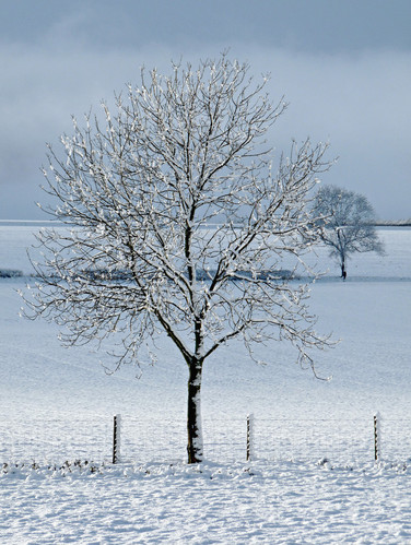 - A beautiful snowy scene and sunny spell. The composition works well, I love the balance of the two trees and also the unbalance of the three posts. Nice light and nice absence of colour. Perhaps the contrast is a tad severe. Nice shot, more of those too please!