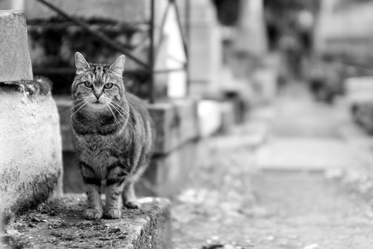 - beautiful environmental capture of what appears to be a world-savvy feline. wonderfully framed, and great use of depth of field along with the receding line of the monuments or tombs(?). the execution of the black and white conversion is perfectly managed. well done! ~ illona