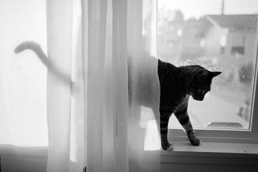 - beautiful image. the choice to convert this to b&w allows the essential elements to really stand out: the tail, the body, the window frame, the curtain, and the distant view ... all beautifully managed as far as light and depth of field. nicely done. ~ illona