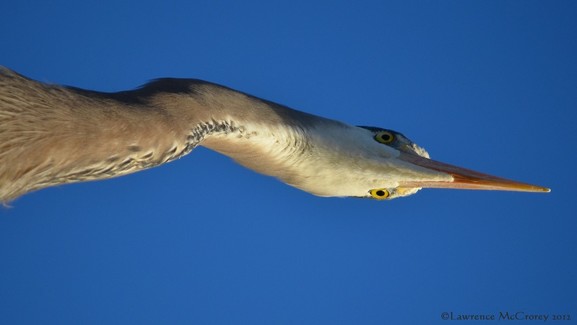 - Thank you very much. My name is Lawrence McCrorey and I live in San Jose, Ca. This Great Blue was perched at the edge of a roof which allowed me to get into 'prey position'. I was surprised at how closely I was tolerated. I'm sure the bird could hear the shutter clicking and my heart pounding. This photo was taken in Campbell, California at the Los Gatos Creek Park using a Nikon D5100 and 55-300mm zoom [f/5.6 1/1600s ISO400 @300mm]. The only post-processing was a curves adjustment.