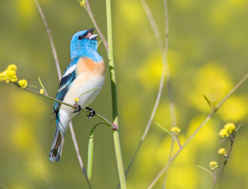 - The perfect picture of Spring as this splendid Lazuli Bunting is caught in full song amongst the budding flowers.