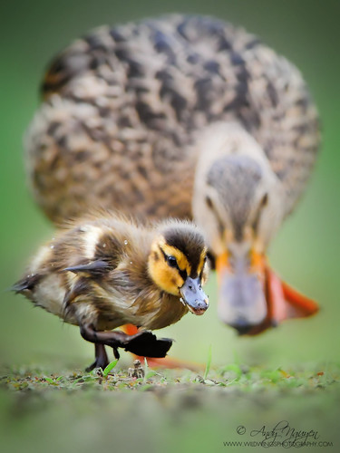 - Thank you for the Winning Prize. In Southern California, Spring showers lasted almost a week straight. It was the first day after the rain, the Mallard hen took her ducklings out for a walk at the local pond. I layed in the wet mud on my belly with my Nikon D300 and a 500mm lens. The baby duck kept walking closer, with mama cautiously following behind. The extremely shallow depth-of-field was the result of short distance between the ducks and the camera. Andy Nguyen.