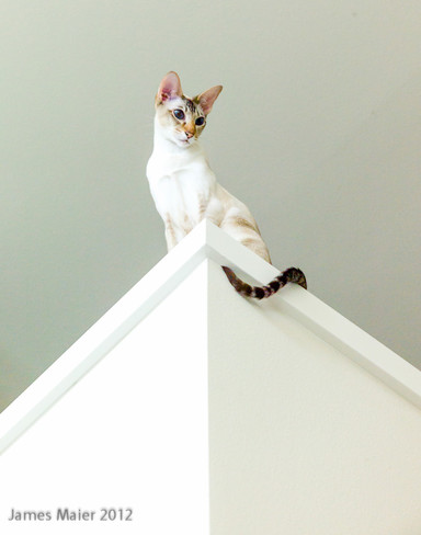 - This photo of my cat Luna was shot with a Leica M9 with a 90mm f/2.8 Elmarit lens. Shot with available light, I kept the aperture wide open. The only post-processing was some color correction in LR. At the top of the stairwell by the dining room is this ledge from which Luna likes to "observe her domain". I shot this from about twenty feet below.