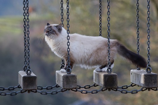 - what a unique shot. love the courage of this cat out on this swing bridge, his chin tilted up with confidence. lovely tones and management of depth of field, and wonderful contrast of textures. nicely done. ~ illona