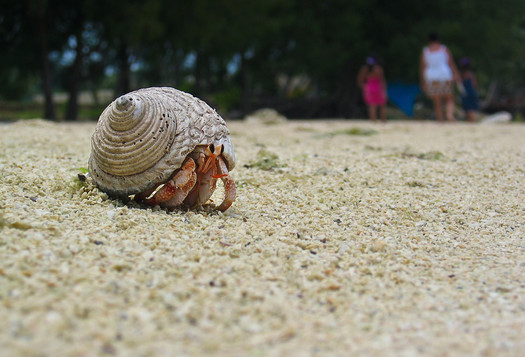 - This photograph shows us how a hermit crab tolerates human proximity (and importantly the vice versa as well) as it makes its way along the beach. It is a sweet portrait of an amusing species and a lovely documentary. I wonder if those people have a mobile-home too…