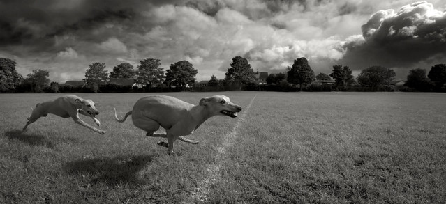 - what a stellar image. the wide frame format is perfect for this dramatic finish-line capture ... the drama in the skies, the shadows in the grass, and the strides captured in the two dogs, are all perfection for this apparently easy finish. VERY nicely done. bravo! ~ illona