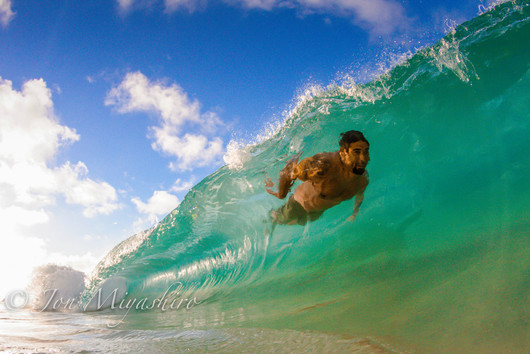 - Aloha, My name is Jon Miyashiro. My friend, Kimo Vincent, in the picture, and I are aspiring wave photographers. This shot was taken during a summer sunrise in 2012 at a popular local bodysurfing/body boarding spot called Sandy Beach on Oahu. My gear consists of a Canon 7D, Tokina fishey and a SPL water housing. Kimo did the post processing using DXO to lighten the exposure a little to enhance the facial expression. Mahalo, Jon