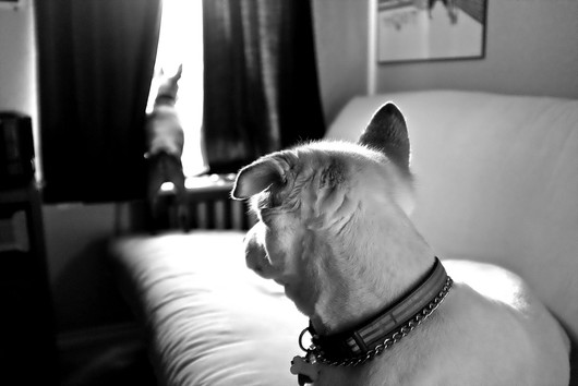 - Thank you very much for selecting this image! My name is Ryan Smith, I live in Austin, Texas. This photo is of two of our five dogs. Our BadLittleRedDog (BLRD) was barking at something outside and Lisa "Left Ear" Lopez-Smith was considering joining in when I took this picture. This is one of the first photos I took with my Fujifilm X100s. 6400 iso, f2, 1/500, JPEG, monochrome w/ red filter setting. So many great photos. Thanks!