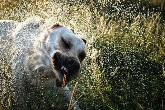 - shake-shots are a dim a dozen ... everyone who shoots dogs shoots them. but once in a while one truly stands out, and this is one of the standouts. the backlighting catching all of the droplets, the tight crop/close quarters, beautiful management of color, light and shadow, and wonderful detail all work to make this image truly special. nicely done! ~ illona