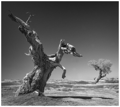 - My name is Tony I am a Pharmacist from Singapore. This photo was taken in the middle of a desert in Xinjiang China with Contax 645 with Aptus 5II and a 35mm equivalent of a 21 mm on tripod. This photo was taken during noon time the lighting was harsh and there are not much color in the surrounding. I walk around this dead before I discovered this angle the dead tree trunk look like a dinosaur feeding on the vegetation. Hence, I decided to convert it into B&W and using high contrast to show the fine details of the dead tree, the living tree in the background is a bonus .Golden Euphrates Poplar 胡楊 the Chinese love and adore this tree for it resilience characteristic. There is a saying that this tress survive for a thousand years and it will not fall for another 1000 years and even it has fallen it will not rot for another 1000 years. [email protected]