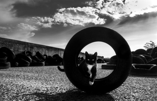 - Well composed cute picture where the black and white of the cat exactly match the black tire.