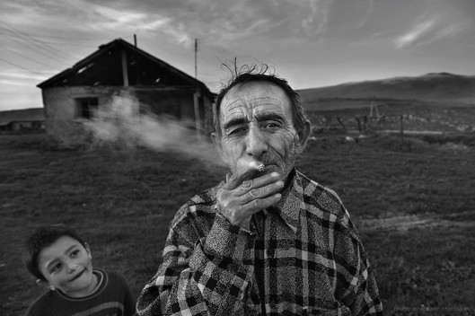 - While not politically correct with the cigarette, this is a great portrait with the man looking straight into the camera and the boy looking with interest and admiration.