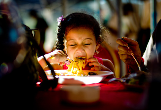 - A nice snapshot of a girl eating her lunch. I like the colors and also the light. The contrast between the red tones in the foreground and the blue and green tones in the blurry background. Well seen and executed!