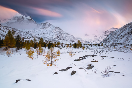 - A lovely shot of this snow scene. Your composition is superb, the stones then the yellow larch trees leading us into the cold snowscape. The very long exposure has worked wonders to the sky, making the ground that much sharper too. Nice use of your neutral density filters has allowed you to get all tones perfectly exposed. Love this.