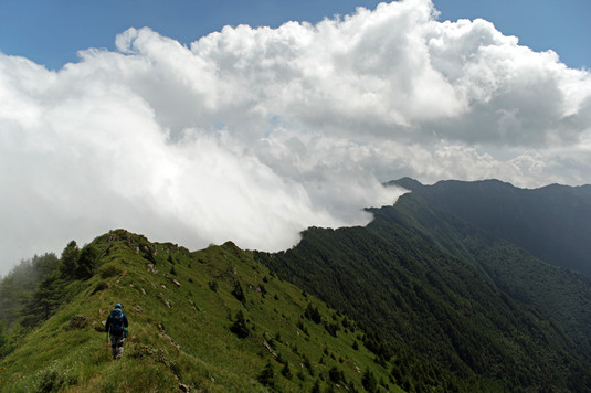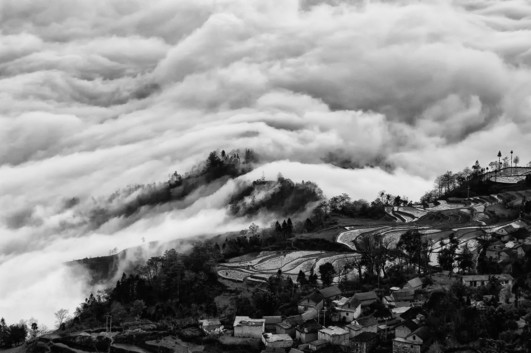 - Two layers of clouds wrap around the mountain peaks. The appearance and structure of these clouds is dissolved, unclear. Like in an impressionist painting, but as a black & white version, leaving the details to our imagination. It shows us that clouds can be above and below.