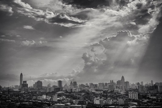 - Clouds as intermediary of the sun rays shining on the skyline of a metropolis. A large portion of the picture is dominated by the illuminated clouds letting them appear like a heavenly gift. The small airplane representing a second connection between the light coming from above and the city beneath. The character of the image matches the composition extremely well.
