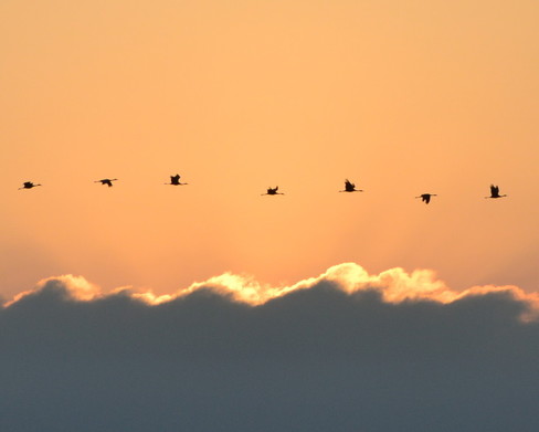 - A flock of crane flying high above the clouds in the early morning or late evening sky. Presented in color, these birds are mere interconnected shadows without detail and the clouds, a band of grey. The picture shows us that there are living things around these clouds. A romantic picture with feeling in a great composition. Wildlife on "cloud level" at its best.