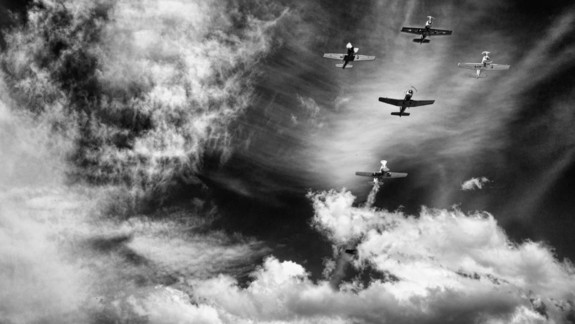 - Fighter planes penetrating the sky - the pilots living in the clouds, manoeuvring through them. This reality is their world, not the ground. Wonderful black & white picture with strong composition.