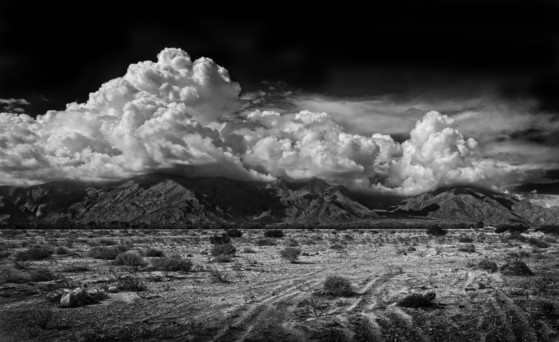 - The desert plain and clouds hanging over the nearby mountains. A threefold in object and in composition. Nicely executed in this strong landscape picture. A black & white in hard contrast. It shows us extremely well that the sky and the clouds are equally important as all other parts in a good landscape photograph.