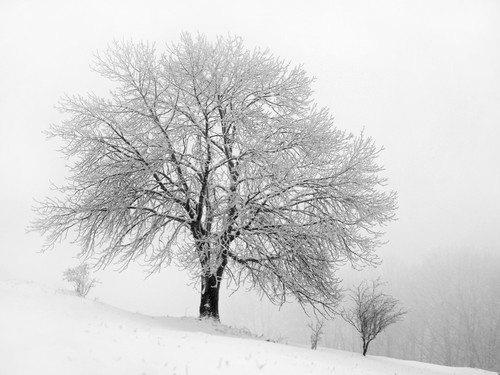 - Thank you very much for voting ! This photo was taken with a Canon 5d Mark II and the Canon 70-200 12,8 l IS USM OBJECTIV. On a foggy, cold winter day I discover this beautiful tree on the slope. The bushes look like little children in the snow.