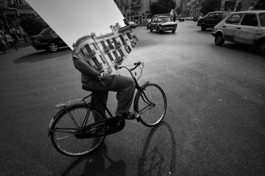 - I've taken this photo in Talaat Harb square in downtown Cairo in 2008. When I've seen this worker carrying this large mirror on his bicycle, I ran towards him as I knew I might get reflections if I got close enough, I was lucky that he waited for the cars to pass, that gave me few seconds to get close, use my wide angle lens, step on my toes and look down to get the most of the reflection, lighting was perfect, the sun was infront of me which meant that the building reflected will be bright while the man and bicycle will be darker. I took the shot and didn't have the chance to see the man.