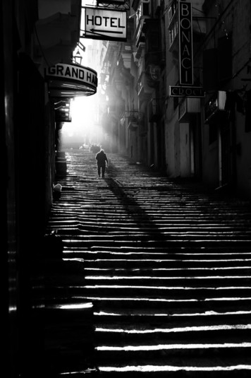 - Paul Borg Olivier, Valletta - MALTA. This photo represent the typical street-scape of Valletta, a UNESCO World Heritage Site and European Cultural Capital for 2018. The photo was shot t 4pm in a November when the position of the sun moves straight into the the street in a direct line on the main axis of the City build in 1566. Knowing the neighbourhood, I went to shoot the empty street, when the man walked out of his house creating an "solar eclipse". I titled this photo (Every Man has a silver lining just like a passing cloud." I shot it with a Leica M9P and a 35 mm cron lens (ISO 200, f2.8, 1/500 LR).
