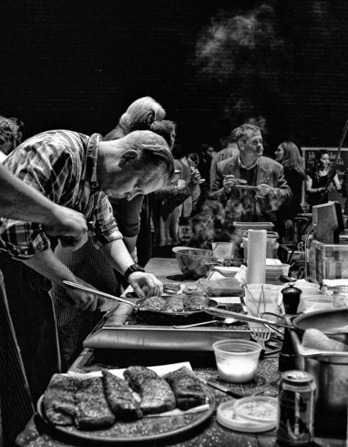 - This is beautiful and absorbing. The concentration in the eyes of the chap cooking make this photo. The care and attention he is giving the preparations contrast nicely with the carefree attitude of the other distant man eating and the relaxed party atmosphere elsewhere. This photo is about the food and its important social role. Great depth and nice monochrome. Congratulations.