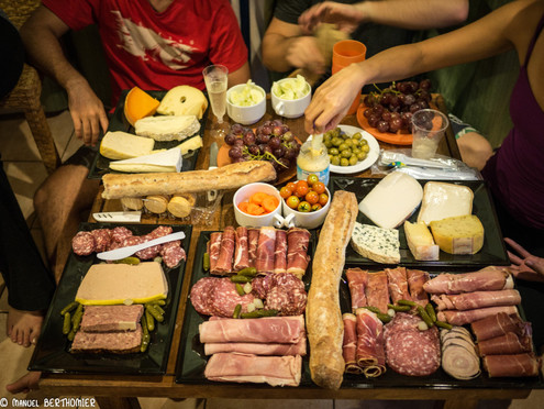 - Great shot of food as the centre of attraction. We all love a dig into this kind of French picnic. The moving hands and bare feet bring a nice homely friend's atmosphere. Well done.