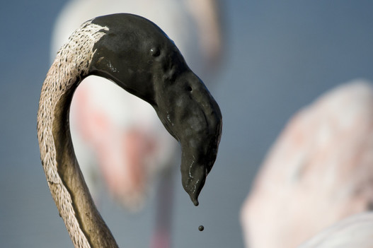 - Most bird photos are taken of birds looking as pristine as possible, so this muddy-faced flamingo has the element of surprise as well as humor.