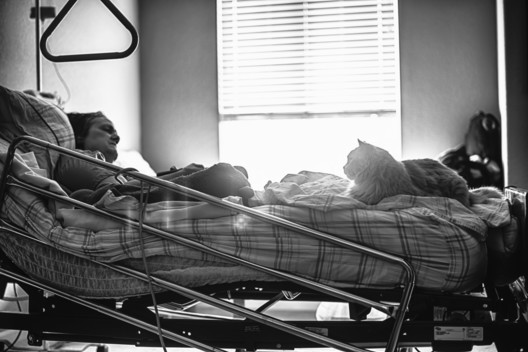 - Thank you for the recognition for this photo. This is a photo of my sister-in-law who is bedridden with MS and her buddy Sheldon Cooper. He keeps her company. Taken with a Nikon D800 and a Nikkor 28-300mm lens.