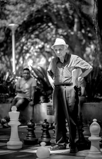 - The light and the feel of the timeless atmosphere in this photo is what we really like. And the poker face trying to show he knows how to play chess. Maybe he does.