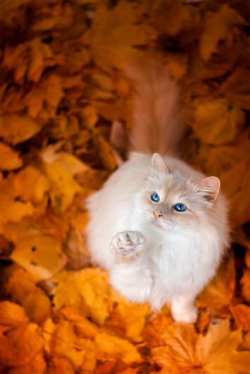 - The colors in this photo are clearly captivating -- the contrast between the orange leaves and the bright blue eyes. But there is just as much strength in the composition of the image, and the cat's engagement with the photographer. Well done. ~ illona