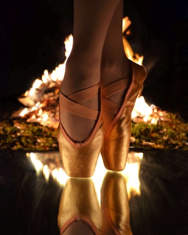 - Thank you for your votes! My name is Cyndi Salata, and I am a self taught photographer from Illinois, USA. This image is one of many of my self portraits. Although this is a classic ballet pose, the rest of the composition was my own idea; an improvised technique with no special effects added. I am posing in front of a real backyard fire pit while standing on a mirror. I didn't do a very good job polishing the mirror, but ended up liking the streaks it left in the final image. The front of my feet are illuminated with votive candles on each side. The camera used was a Nikon 7000.