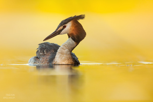 - Last summer I have been searching grebes at several lakes around Bonn, Germany. I found some, but they would not let me come close. So I put on my diving suit, set up my tripod slightly below water level and set up my cam on top of it 5cm above water level. This way I could take this shot deep down at water-level and get this perspective. The yellow colors origin from the warm and soft sunlight right before dusk shining on yellow trees on the other side of the lake. The grebe itself was in the shadow. To take this picture I needed to wait in the lake for more than two weeks. The diving suit really was a big help. Equipment used: Most important: Berlebach UNI tripod + Berlebach Pegasus head Cam: Canon 5D Mark 2 Lens: EF 400 2.8 L II (non is) + 1.4x TC (Canon Version 1) + 1.4x TC (Kenko) [I lost my Canon EF 2x III in this lake, so I needed to stack my other two converters] Colors are ooc.