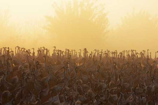 - A mass of cranes backlit in the morning mist makes for a highly evocative image