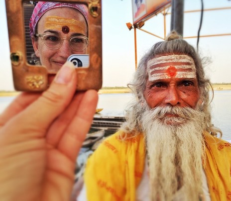 - That's me, on the left ! ;-) My name is Adria Ellis and I am an artist and a photographer. I took this image last March in Varanasi India with my iPhone 5S. It's a pretty straight shot, I lightened the faces just a tad but thats about it. Snapseed is my goto App for fine tuning. I use to have big cameras and gear and things like that but for me Less is more. I spent three weeks in India on a photography pilgrimage with two iPhones. It's hard to have a favorite in India but if I win this contest I would like to spend a month in Varanasi. For me it's the people. This man is a Sadhu, or Baba - he's a holy man. Very few possesions and committed to releasing Karma. He was generous with his time, loved being photographed and offered me his blessing and coconut shavings. When I return I will bring him this picture.
