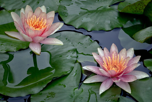 - Image by Peter Hewitt (freelance, fine art, landscape photographer). The composition of these two Hardy Waterlilies (Nymphaea 'David') was created right after a rain shower at the summer Waterlily Display, Longwood Gardens, Kennett Square, PA. The equipment and exposure settings used were: Canon 5D Mark II camera, EF 180mm f/3.5L Macro USM lens, exposed for 1/4 sec. at f/22 using a 180mm focal length. Minimal post processing was done using only Lightroom for the conversion of the RAW image into a TIFF, with typical adjustments needed on a 'neutral' RAW image for sharpening, exposure, contrast, saturation, highlights and color. Shooting flowers on rainy, overcast days or in open shade naturally brings out great color saturation. The water drops also help to bring interest and depth to the plants.