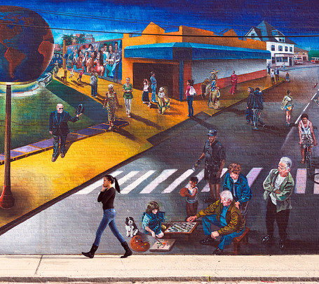 - Photo was taken in Providence, RI-USA. As with most street shooters, I first saw the mural.. while determining the best angle of approach.. This young lady strolled past focused on her telephone call.... She became the perfect subject for the painted men to leer at.. Lumix DMC-GF1, Lumix 20mm / f1.7 Pancake. f4.0 @ 1/500 Camera RAW - Cropped in Apple Aperture