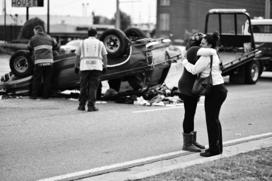 - First, please allow me to congratulate the first prize winner, all other winners, as well as thank the judges. My name is Robert Jones. I’m a freelance photographer living and working in Columbus Ga. I captured this shot while driving home from a local parade with my family. While riding down the street we heard an awful crashing sound. I immediately looked in the rearview mirror while at a red light and saw this horrible accident. We quickly turned around to get a closer look to see if anyone was hurt and in need of help? When we discovered everyone was miraculously uninjured I jumped out of the car to snap a few pictures. I was fortunate enough to catch this moment of the two drivers involved in the accident giving each other a very loving, and sympathetic embrace. It was both a sad and beautiful moment of human compassion during a difficult situation. I shot this image with my Nikon D800 and 85mm f/I.8 lens. For post processing I used Silver Efex Pro. Thanks again!
