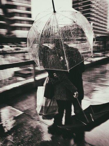 - Kiss NY. Some shots you can prepare for, others just jump at you at the most unexpected moments. I shoot with a Canon 1dx and and sometimes a smaller Fuji x series. I had to circle around twice hoping not to disturb this couple. Therefore the shot is taken while walking past them. Hence the lack of focus. Be that as it may what I like of the final shot is that the interior of the umbrella is clearly more focused than the rest of the shot reflecting, to me, the stillness of their kiss within an otherwise stormy winter day. Everything stops in that moment and space for them. The Black and White is processed on Silver Efex Pro and I chose a slight magenta toning effect to bring the moment more to life on screen and maintain the deepness of contrast. For Print I use a Neutral B&W toning. No other processing has been applied. Thank you for your mention and support and congratulations to the First Prize Winner as well as to all other mentions and winning photographers.